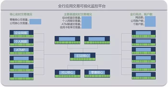 项目一期建成了行内第一个应用交易监控平台,监控了网银、支付、黄金、三方存管等 10 个业务系统,监控点分布在4 个网络区域,覆盖各个主要系统组件,包括防火墙、负载均衡、Web&App 服务器、DB 等。