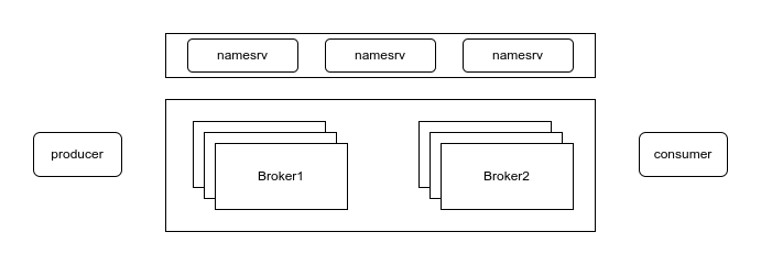 我们知道在 Raft 协议中,一般配置三个节点,利用机器冗余 + 自动选主切换来实现高可用的目标。因此在小米引入 RocketMQ 之初,单 Broker 组均部署三个 Broker 节点。同时为了保证集群中始终存在 Master 节点,我们一般会至少部署两个 Broker 组,一个简单的部署架构图如下:
