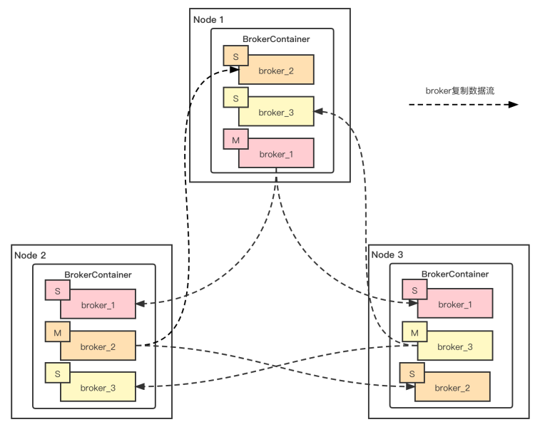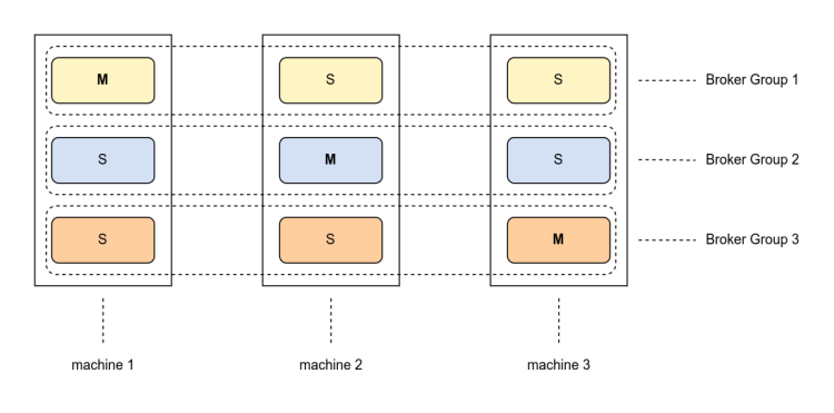 可以看到,Container 作为进程运行,原本的 Broker 被抽象为 Container 的一部分,同样的 3 台机器上我们可以运行 9个 Broker 节点,组成三个 Broker组,每台服务主机上存在一个 Master 节点,使用 Container 对等部署 Broker 之后,每台服务主机都得到了利用,同样的机器数,理论上可以提供三倍的性能。