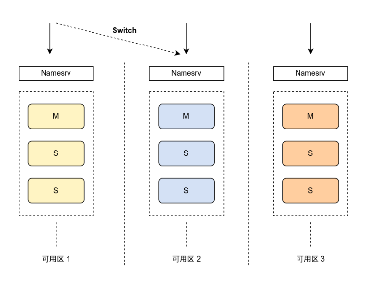 用户视角看到的是三个独立的集群,需要在相同的可用区部署客户端去读写同机房的 RocketMQ 集群。举个例子:可用区1的客户端正常情况下访问可用区1的 RocketMQ 集群Cluster-1,当Cluster-1故障时,用户需要手动更改客户端的连接地址来切换集群,进而将流量转移到其他机房的集群中。用户可以通过配置下发去热更新连接地址,也可以修改配置重启客户端来切换,但这一切的操作前提都是:需要业务感知到 RocketMQ 集群故障,手动触发才可以。