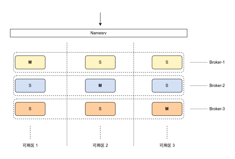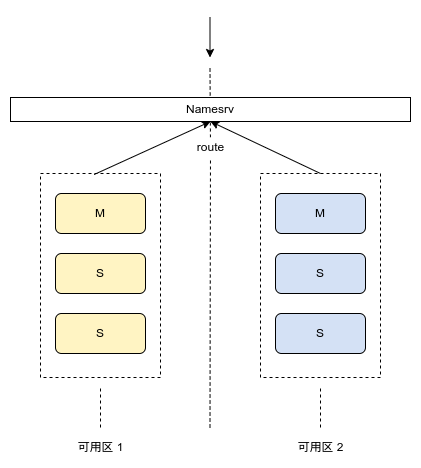RocketMQ 所有 Broker 都会将自己注册到 Namesrv 上去,一旦某个 Broker 组故障,那么它的信息将会被从 Namesrv 中移除,客户端也就无法再向这类 Broker 组发送、拉取消息。基于以上逻辑,只要我们将 Broker组部署在不同机房中,便可以做到机房级别的灾备效果。部署架构如下: