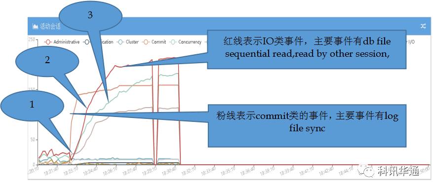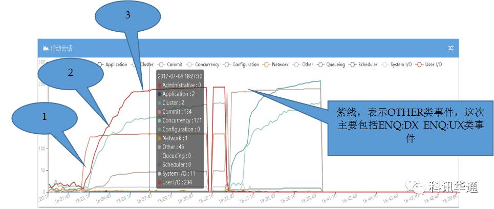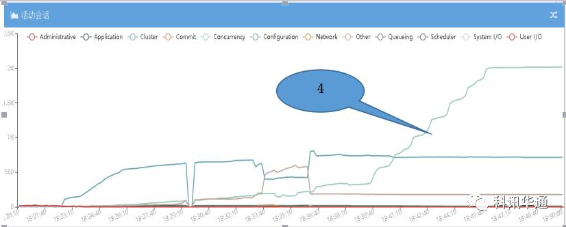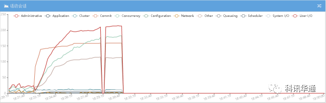 由于故障期间是由于数据库HANG导致,所以故障期间的AWR报告和ASH报告均未生成。以下分析完全借助科讯华通自主研发的DCMP系统的帮助,该系统在问题时刻仍然在采集数据库挂起前一刻的详细相关信息,这极大帮助该问题的定位判断,报告中相关截图均来自DCMP产品.