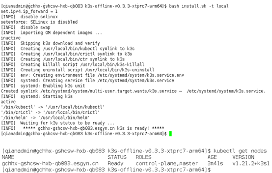 执行 bash install.sh -t local。安装完成后,执行 kubectl get nodes 命令, 查看 k3s 节点状态信息,STATUS状态显示 “Rready”为正常。