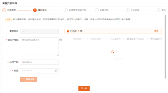 在主机IP地址写入安装的主机IP,以","分割,如果IP连续,可使用正则例如:10.128.66.[85-94],并输入分配给的用户名、密码,点击【查找主机】获取需要安装的主机信息,点击【下一步】
