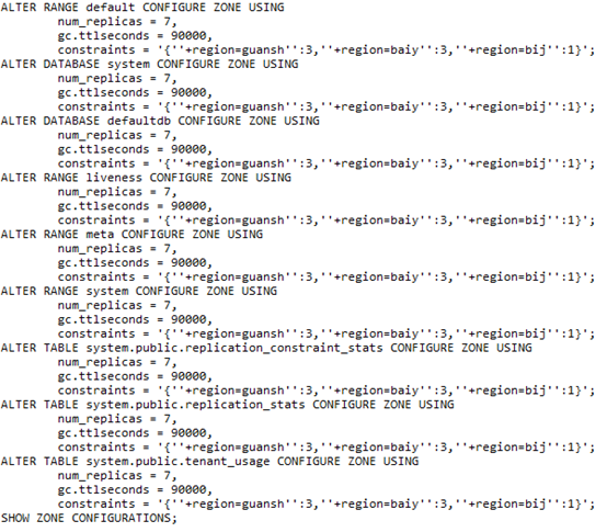 数据库安装好之后,默认是最大可用模式。进入其中一个节点,配置两地三中心的副本(采用331副本配置),在sql命令行执行如下命令
