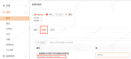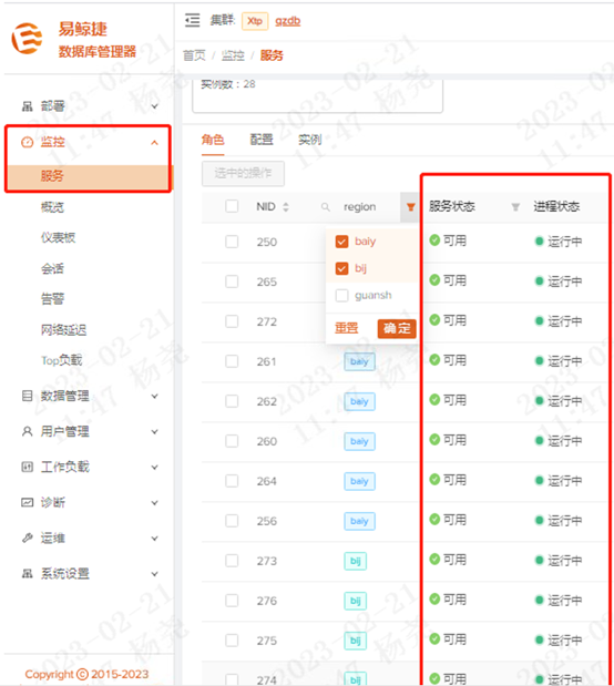 1.在OM对应机器中选择【监控】->【服务】的服务界面region筛选框,选择baiy(同城),bij(异地),确认同城、异地数据库进程状态正常