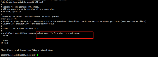 在同城机房服务器使用qsql命令在数据节点登录到数据库,查看副本是否正常(如果能正常显示结果,则说明副本正常)。