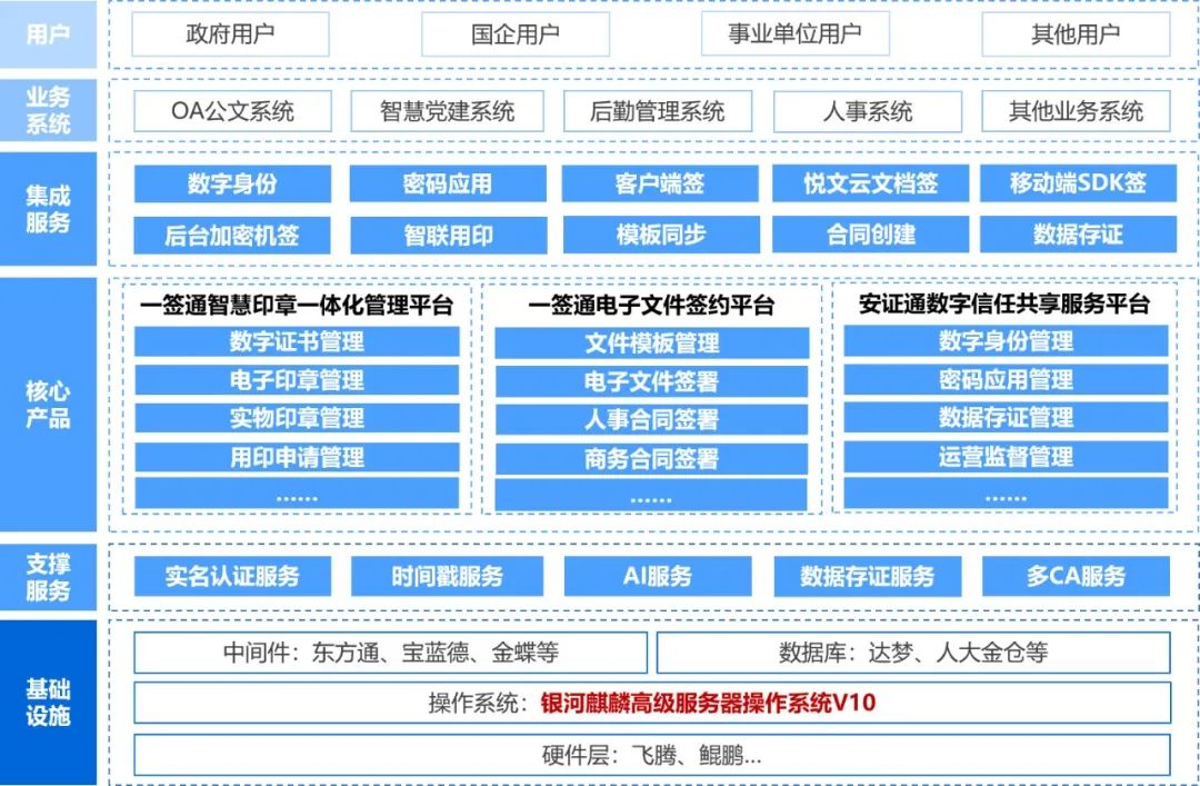 该方案依托银河麒麟操作系统及国产主流软硬件产品为用户提供底层支撑,建立实名认证服务、时间戳服务、AI服务、数据存证服务、多CA服务等能力,可为各个业务系统提供智慧印章、电子签约、数字信任共享核心服务,确保各行业用户可在自主创新环境下实现各个业务场景的印章管控、电子签章、电子签约、密码应用、身份认证等多种安全服务需求。