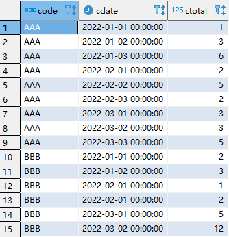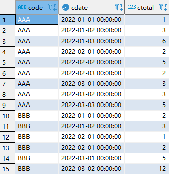同事提了个需求,如下的测试表,有code、cdate和ctotal三列,