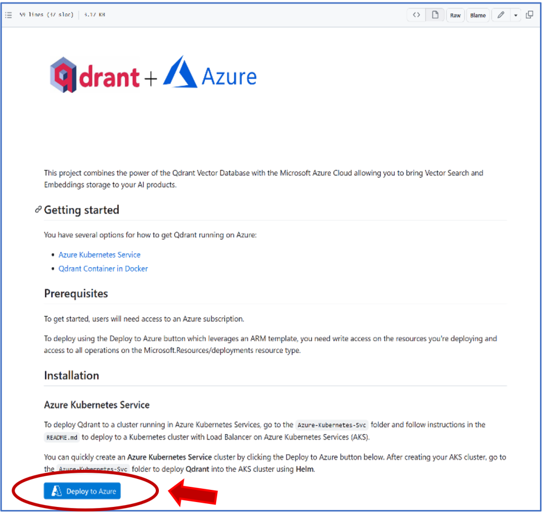 下一站,回到在浏览器中打开的 Azure GitHub repo 中的 Qdrant 页面。在 repo 的 README 文件中,有一个 ARM(Azure资源管理器)按钮。