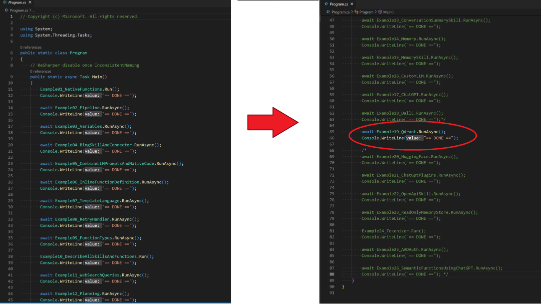 在打开的项目中,转到Program.cs文件的Program类,您将看到可用的示例列表。批注排除(或删除)除了Example19_Qdrant.cs示例的命令之外的所有示例,该示例的代码行为await Example19_Qdrant.RunAsync();。