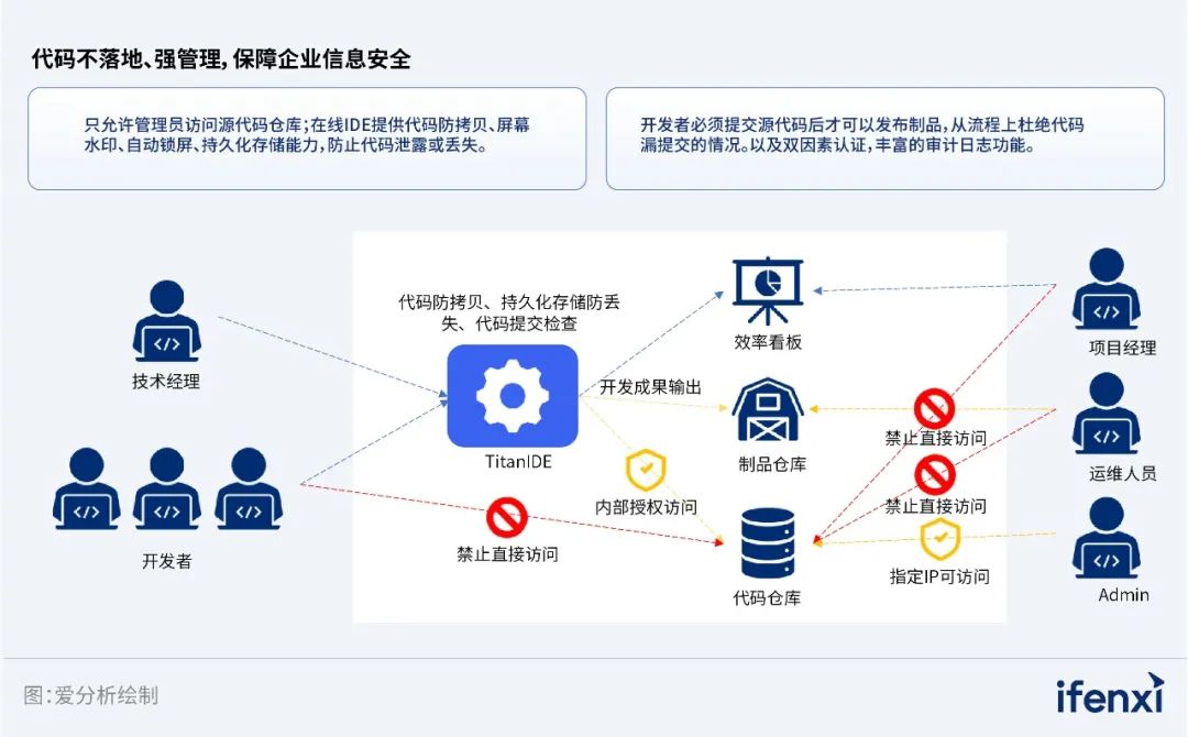 厂商评估: 强大的安全防护机制,全面保障企业核心资产不受侵害。为避免因代码泄露,而导致企业核心资产遭受损害,TitanIDE配备了完善、全面的安全防护机制。第一,区别于传统开发工具,TitanIDE只将代码保存在企业服务器端,从源头上避免了代码由本地终端泄露的风险;第二,TitanIDE还具备代码防拷贝、屏幕水印、双因素认证等多重安全防护手段,进一步保障了代码开发的安全性;第三,TitanIDE具备全面的审计流程和用户权限管理体系,可实现具体到个人的精细授权,有效的切断了代码泄露路径。此外,TitanIDE提供详实的操作日志,便于对用户行为进行追踪和分析。通过三重手段的共同作用,使企业代码、数据、文档等核心数字化资产的安全性得到了极大的保障。
