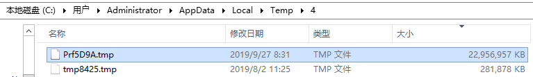 登陆数据库服务器查看C 盘空间几乎耗尽,剩余空间不足100M ;查找大文件,发现在C:\ 用户\Administrator\AppData\Local\Temp\4 目录下有一个22G 大小的临时文件。