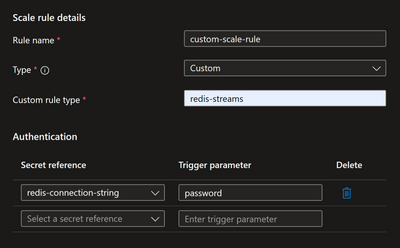 每个基于 KEDA 的扩展器定制规则类型各有差异。触发参数可被设为“密码”。编辑如下字段,指定元数据参数。