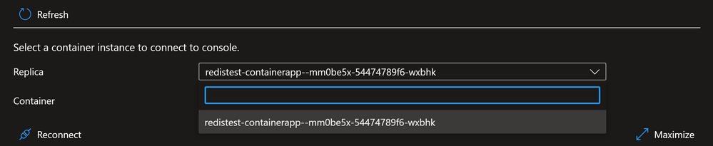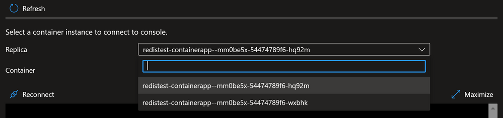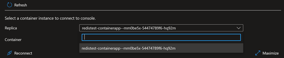 推荐大家将两个浏览器选项卡并排打开,其一显示 Redis Cache 控制台,其二显示 Container App控制台边栏选项卡。流中在刚开始并无消息,Replica 下拉菜单仅有单一的复制(即 minReplica 数量设置为1的情况)。