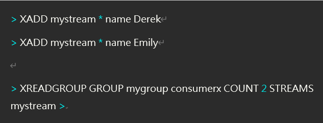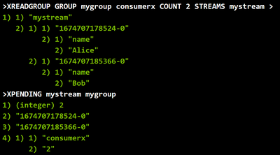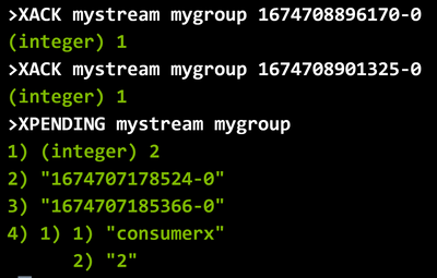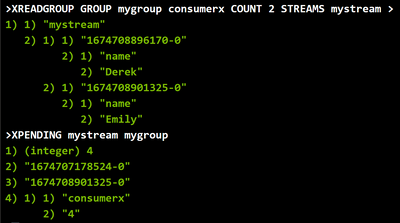 对于本示例,我们从最后一条 XREADGROUP 命令的结果中选择两个messageIDs(分别为1674708896170-0和1674708901325-0,对应 Derek 和 Emily)。
