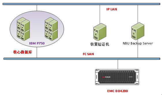 这家银行Netbackup集中备份系统组成为:一台备份服务器(MasterServer+MediaServer),两台核心informix主数据(HA)为Media Server(LAN Free),恢复验证机为普通客户端。