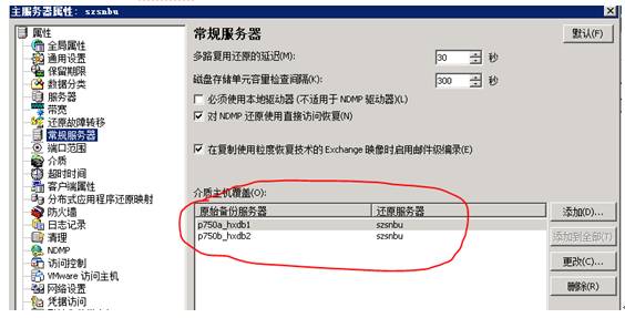 Ø 因为恢复验证机不是media server,只能借助备份服务器读取磁带库(同时也是Media Server)来恢复数据,因此启动NBU Admin Console控制台,在主服务器szsnbu属性中,找到常规服务器,在介质主机覆盖中加入如下条目,含义为:允许原始备份服务器的数据通过szsnbu服务器恢复,如下图: