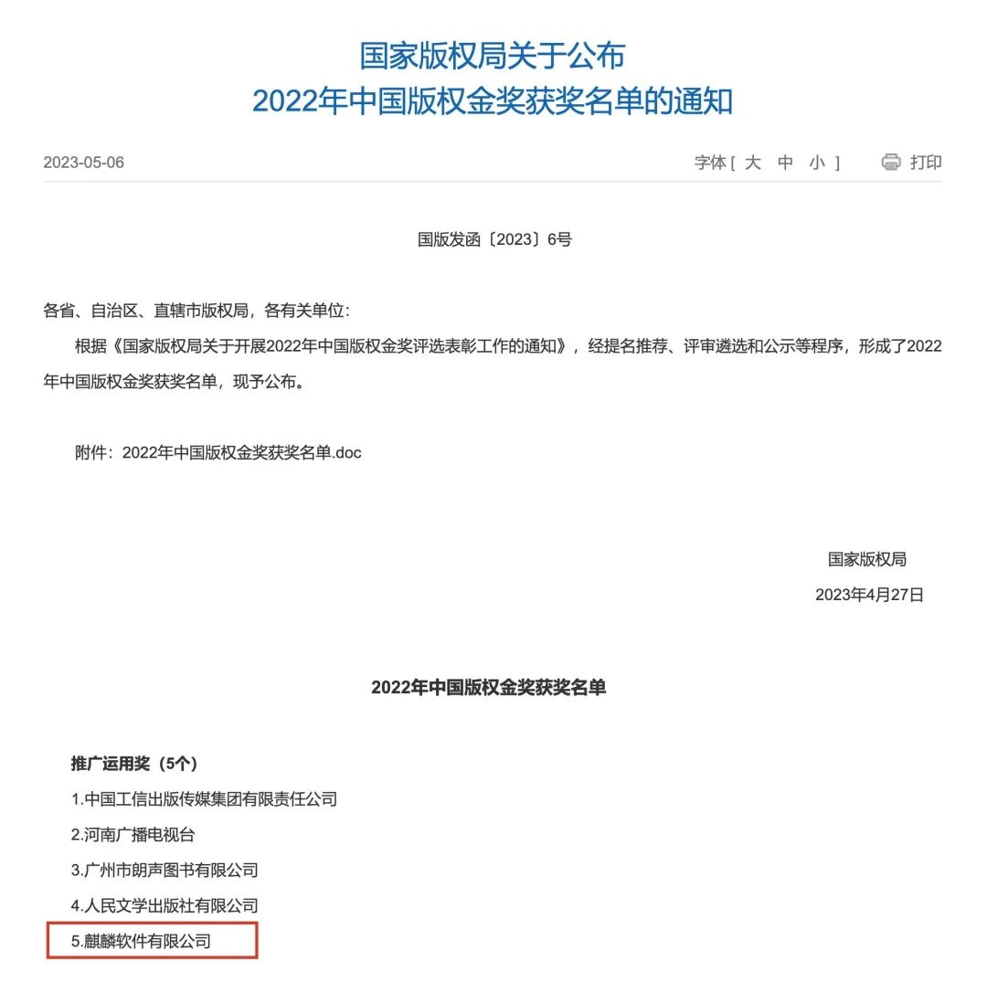 麒麟软件作为中国版权协会重要成员和天津市版权示范单位,始终坚持践行服务国家的使命,以高度的责任感紧跟国家版权工作节奏,以自主创新推动企业发展,努力做好版权保护的推动者、践行者和倡导者。未来,麒麟软件将继续全面加强知识产权保护工作,为提高全社会的版权保护意识和推进版权强国建设贡献力量。