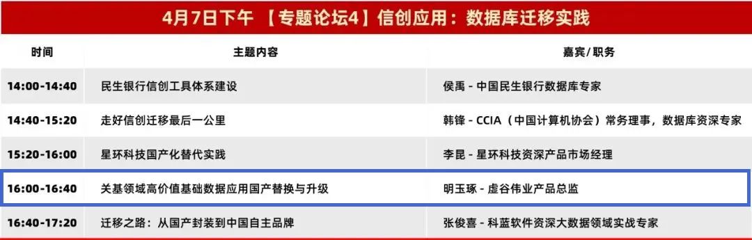 会上,虚谷伟业产品总监明玉琢,在4月7日的“信创应用:数据库迁移实践”专题论坛上进行了“关基领域高价值基础数据应用国产替换与升级”的探讨。