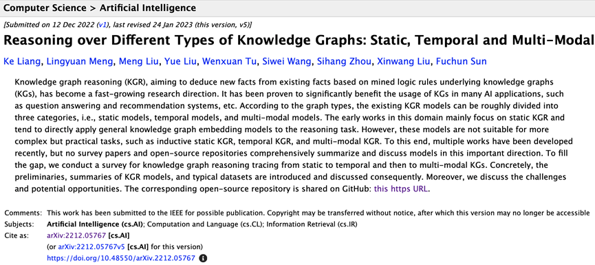 本周推荐的是一篇近期发布于arxiv上的综述:Reasoning over different types of knowledge graphs: static, temporal and multi-modal,对静态、时间、多模态等不同类型的知识图谱上的推理技术进行系统性地概括。作者来自国防科技大学和清华大学等。