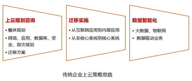 这些特点决定了传统企业上云采用思路的不同性,为了保障系统上云的平稳与成功率,传统企业上云通常采用上云规划咨询+迁移实施两步走的方式,规划咨询阶段从整体架构、网络、应用、数据库、容灾、安全、上云路径等方面规划出发,为第二阶段的迁移实施打下坚实基础。