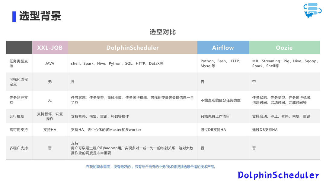 在选型的过程中,我们主要对比了以下几款调度系统:XXL-JOB、Airflow、Oozie 和 Apache DolphinScheduler。