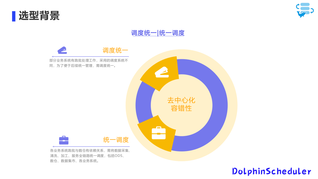 实际上,我们认为在进行开源软件选型时,没有最好的选择,只有结合自身业务需求找到最适合自己的方案。我们选用Apache DolphinScheduler,是因为它更符合我们的需求。比如去中心化的容错性,去中心化的部署模式和容错性高决定让我选择了它,并且我们要在调度方面做两件事。