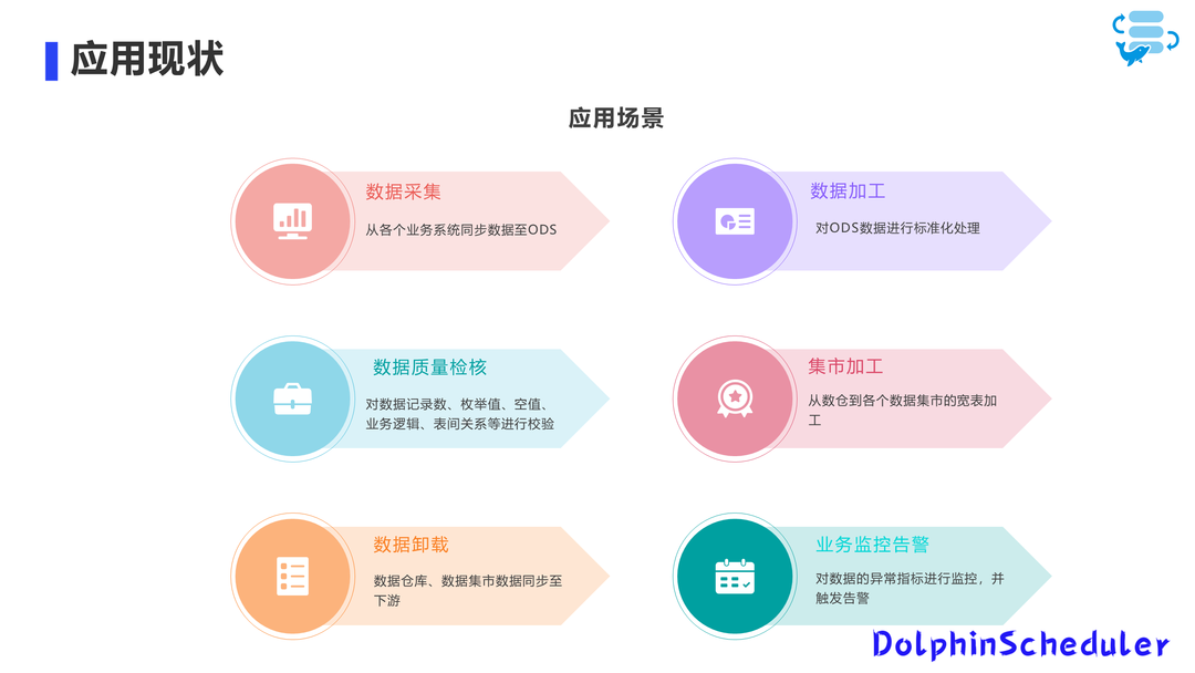 应用场景分为 6 大类:数据采集、数据加工、数据质量检核、集市加工、数据卸载和业务监控告警。