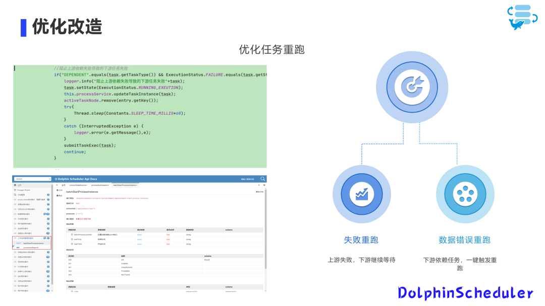 其次还有“重跑”的优化,因为从 ODS 到整个下游数据加工的链路很长,如果说某个上游任务出错了或者说数据质量有问题,这时候要重跑,怎么办?我们不可能把每个任务的依赖都找出来重新再跑,而且也很难找全,类似这个情况在我们这边发生了很多次,也是让我们很痛苦!