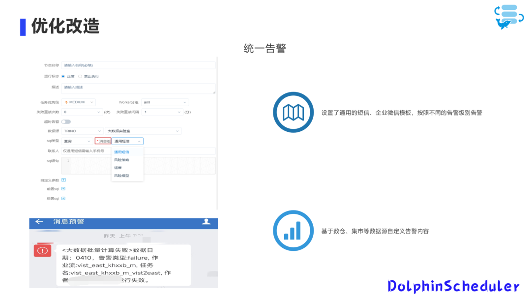 目前调度已经统一了,并且也实现了统一调度,包括 ODS 、数仓、数据集市、各业务系统的交互,统一由DS进行调度,还有下游系统,如营销、风控的贷中贷后的管理,基本上都是用 Apache DolphinScheduler 来做的统一调度。