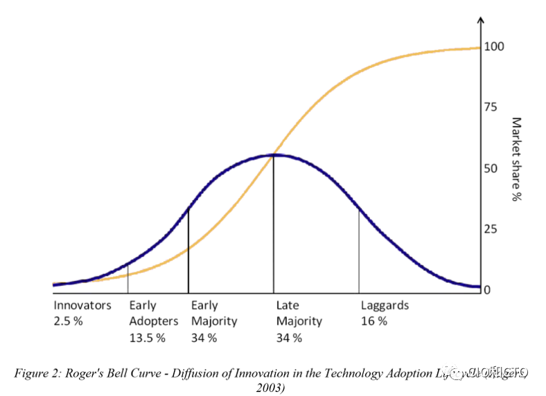 罗杰斯假设,在创新理论的扩散下,技术被采用的速度可以被描绘成在x-y轴上的标准化高斯分布——或“钟形曲线”——首先熟悉笛卡尔坐标系。其中,罗杰斯发现并表明,采纳者被分为五个部分取决于他们在这个采纳年表下降。最早的采用者是“创新者”,占市场的2.5%。按时间顺序排列的第二位采用者是“早期采用者”,占市场的13.5%。“早期多数”采用者排在第三位,占市场的34.5%。“后期多数”采用者占市场的34.5%,排在第四位。而且,“落后者”占市场的最后16%(罗杰斯,2003年)(见图2)。此外,罗杰斯假设,每一类采纳者都经历了四个认知阶段:(1)意识;(2)采纳或拒绝的决定;(3)初始使用;(4)继续使用;在他们的决定步骤中,影响采纳者最大的五个因素是:(i)相对优势;(ii)兼容性;(iii)复杂性;(iv)可试性;(v)可观测性(LaMorte,2018)。