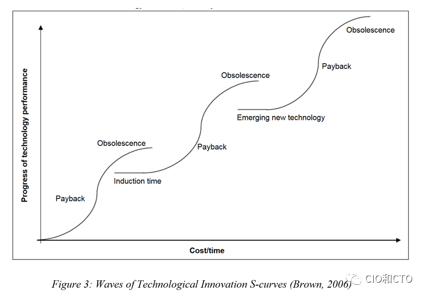 虽然所有的学术和概念理论都被新的假设和发现不断地调整和调整,但在1962年至2015年间,罗杰斯所宣传的作为创新扩散和技术采用模型的钟形曲线出现了五大演变。与此相关的第一个主要演变是技术S曲线,由Richard Foster于1986年发起,由Clayton Christensen于1997年在其开创性著作《创新者的困境》(Foster,1986)中更广泛地应用(Christensen,1997)。福斯特推断,技术创新可以用x轴上的成本和/或时间和y轴上的技术绩效进度来表示,其中新技术的曲线或线总是某种形式的“S”,新技术的诱导时间(“研发”)是基础,通过采用的回报或投资回报是纵向的,市场饱和和过时是“S”的顶部(Foster,1986)。其次,Christensen指出,这些“S”曲线伴随着一系列的波动(见图3),其中决定其成功的关键因素是:(a)组织进入曲线的时间范围,以避免被更有先见之明的竞争对手淘汰;以及,(b) 他们在不中断的情况下不断创新的能力,以保持这些“S”波长期持续(Christensen,1997)。第三,克里斯滕森接着指出了技术创新是否被采纳的两个关键原因,以及采纳或拒绝的速度;这与采纳者的相对需要和资源有关。如果现状在现有资源范围内满足了潜在采用者的需求,他们就会坚持现状,推迟或拒绝创新。同样,如果一项技术创新不在采纳者给定的资源范围内,不管在某些情况下是否有感知的需求,采纳者也会固守现状,拒绝或推迟创新。这些原因是医疗机构采用人工智能和类似新技术的关键(Christensen,2015)。