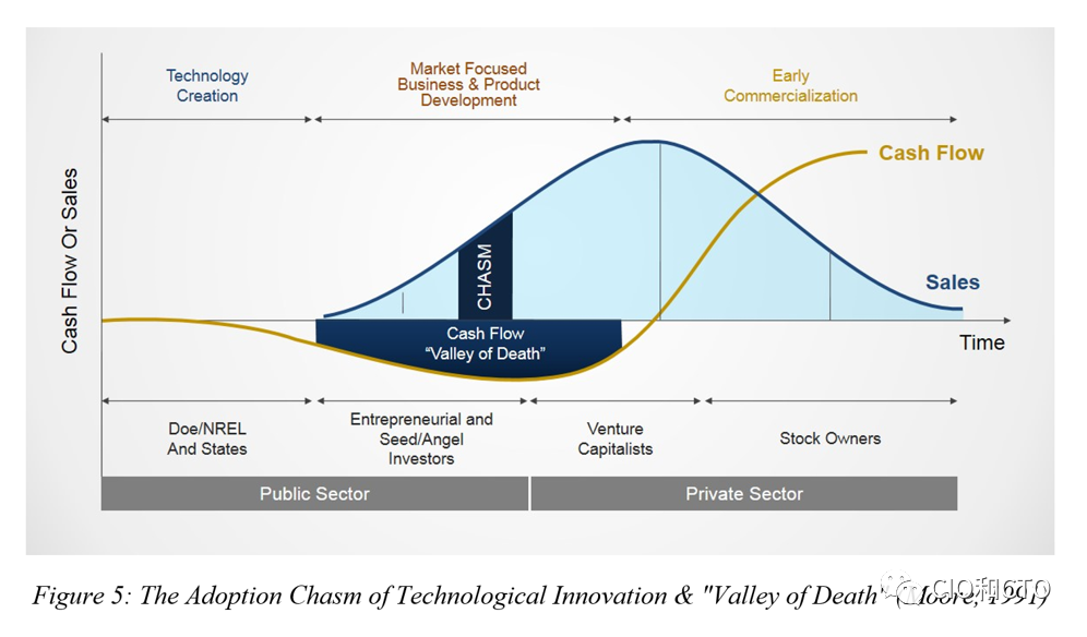 过于简单化,摩尔认为,有一个鸿沟之间的早期和多数采用,因为他们有实质上不同的心理特征,以如何和为什么他们作出决定。创新者和早期采用者有一种赞成采用的偏见,因为他们对新能力有内在的欣赏;他们倾向于喜欢、想要和采用这些能力。然而,68%的市场构成了其早期和晚期的多数,更注重实用性-克里斯滕森写的那种需求和资源。大多数市场人士也持怀疑态度,通常是根据经验,他们知道,绝大多数新技术创新永远不会走远,也不会持久(Moore,1991)。后来的多数采纳者与早期的多数采纳者有着相同的比例,他们的不同之处在于他们对自己实施组织变革的能力缺乏信心(Moore,1991)。摩尔认为,要克服这些怀疑论者,区分一项技术的存在需要大量的教育、营销和关系建设,而这又需要持久力,而持久力又需要资本——比大多数公司拥有或能够筹集的资本还要多,创造技术创新初创企业的“死亡谷”(见图5)(Moore,1991)。