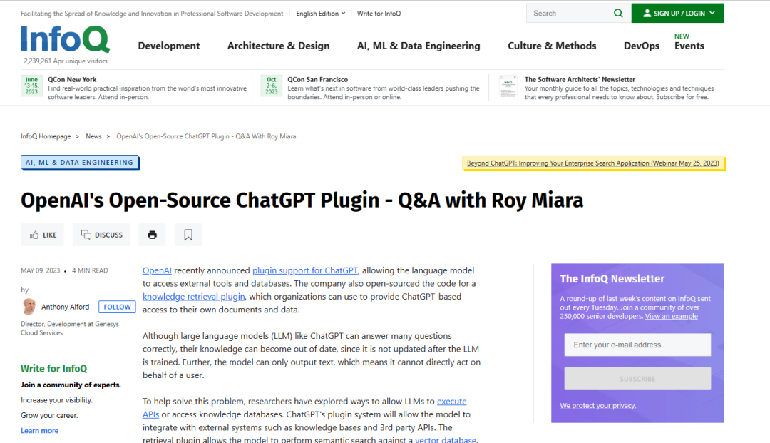 OpenAI 推出开源 ChatGPT 插件 摘要:OpenAI 近期宣布对 ChatGPT 的插件支持,允许语言模型访问外部工具和数据库。企业可以使用该插件提供基于 ChatGPT 的访问权限来访问自己的文档和数据。