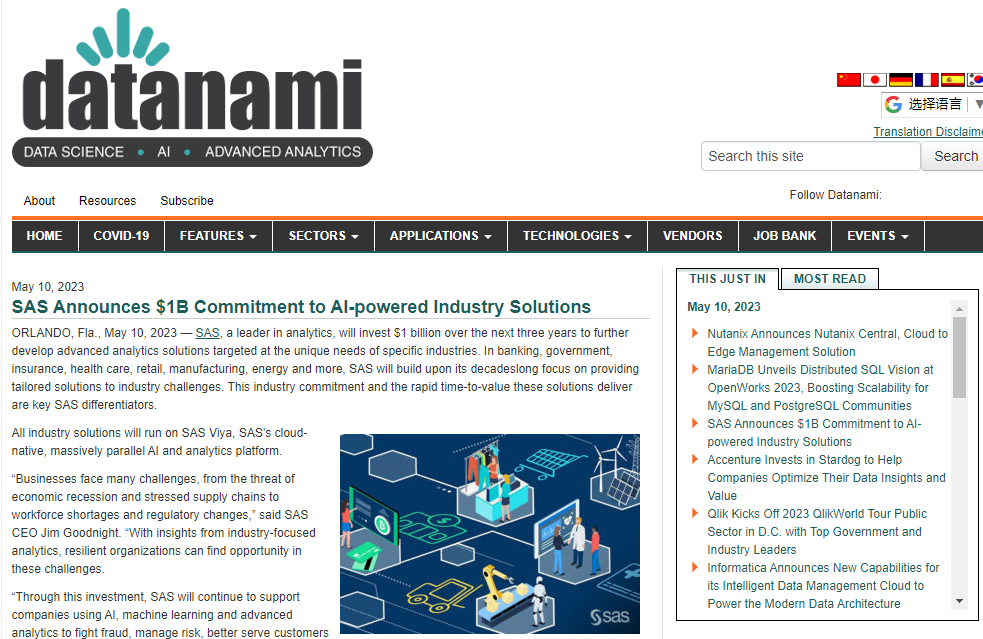 SAS 宣布对 AI 驱动的 行业解决方案投入 10 亿美元