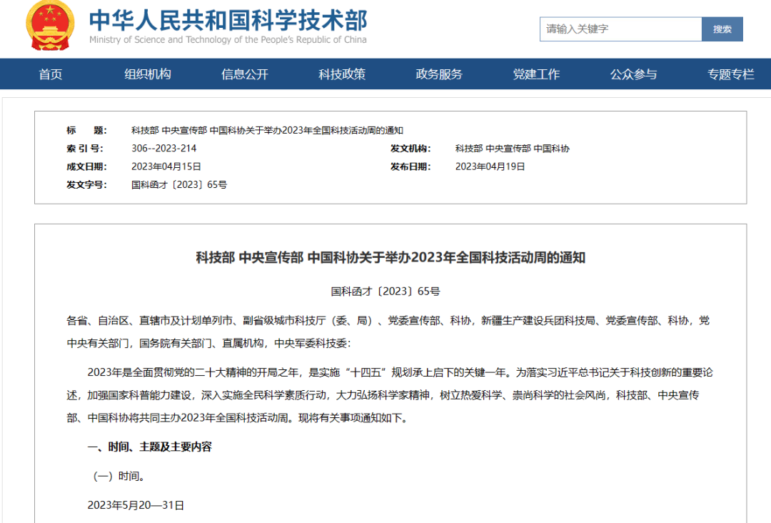 2023 年全国科技活动周 将于 5 月 20 日至 31 日举行