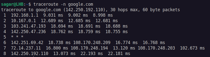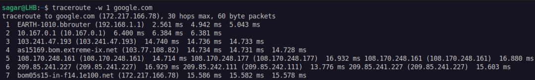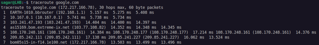 traceroute 类似于 ping 命令,但是提供了更详细的信息输出,它跟踪从原点到目标系统的路由。当你连接到某个远程系统时,数据会经过几个中间节点(比如你的路由器,ISP路由等等)的传输。