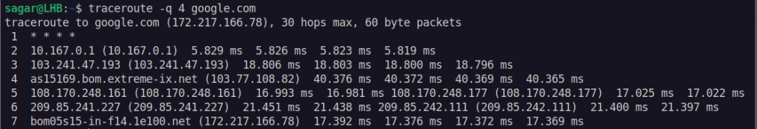 默认情况下,traceroute 为一个跃点(hop)发送3个包,如果想更改此行为,可使用 -q 选项。