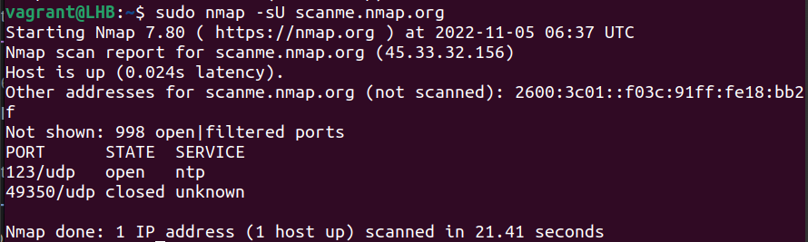 sudo nmap -sU scanme.nmap.org