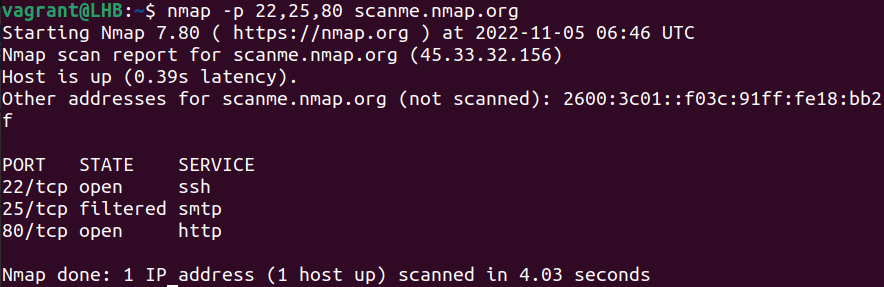 nmap -p 22,25,80 scanme.nmap.org