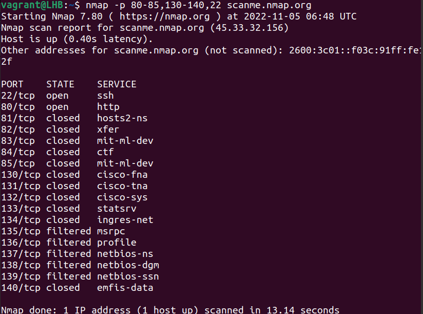 nmap -p 80-85,130-140,22 scanme.nmap.org