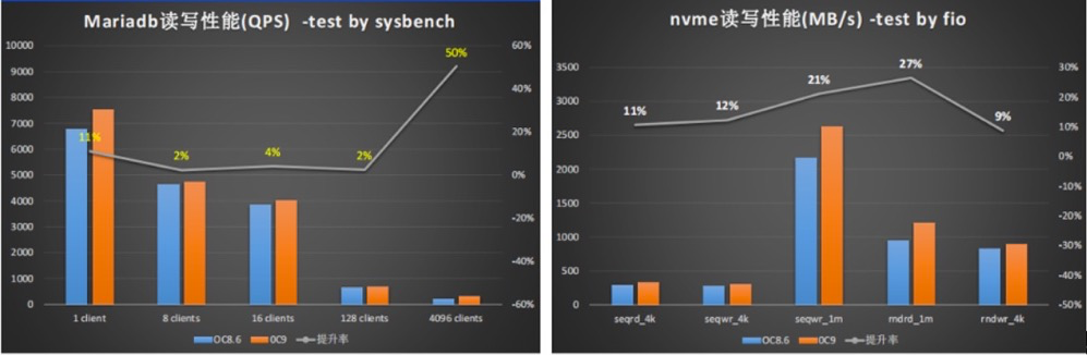 本次发布的 OC 9.0 使用上游社区最新内核 Kernel 6.1,应用了上游及自研的最新组件,包括 GCC 12、LLVM 14、Kona JDK 11/17 、Glibc 2.35、Python 3.10、Rust 1.64.0 等。在系统服务方面,OC 9.0 也进行了全栈版本升级。基于 Systemd 251,支持 Cgroup v2 更多特性;dracut 支持 zstd 固件、并行探测;GRUB2 支持 TPM、NVMe 设备、RAID5;存储、文件及设备管理也进行了全面的版本升级,如逻辑卷管理 LVM2 2.03.16,文件系统工具 e2fsprogs 1.46.5,分区工具 Parted 3.5。网络服务方面,集成 Nftables 1.0.4,iptables 1.8.8 等网络工具。在安全方面,OC 9.0 对系统内核进行了优化,提供 GPG 加解密加速,PAM 新增验证模块等能力,并支持 OpenSSL 3.0 及更多密码算法,部分软件原生支持 SM3、SM4 国密算法。部分软件原生支持国密算法,提供了更加安全的数据保障。OC 9.0 提升了内存管理效率,基于 MGLRU、Mapple Tree 等特性,具备完善的 Cgroup V2 支持、多架构热补丁支持,并提供细致化的调优与系统适配。相对于已发布的 OC 8.6 版本,OC 9.0 在性能上也有明显提升。基于两个典型业务场景的数据对比,Mariadb 数据库性能上,OC 9.0 在多线程(4096 clients)下比 OC 8.6 数据库读写性能提升 50.49%;Nvme 读写性能上在随机读(rndrd_1m)下比 OC 8.6 性能提升26.5%,顺序写(seqwr_1m)提升 21.16%。OpenCloudOS 9.0 全部特性汇总,请查看: