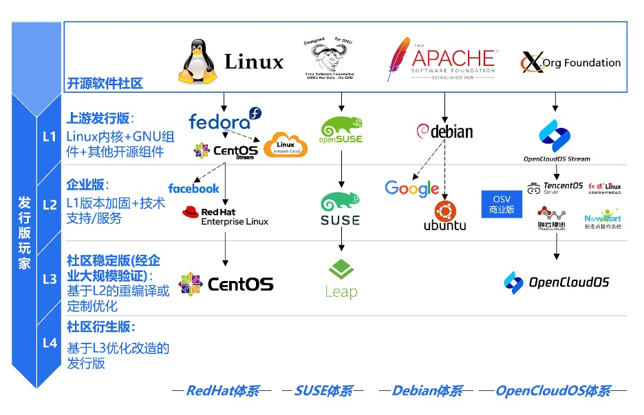 当前,服务器操作系统发行版包含从 L1 到 L3 的不同层级。其中,L1 基于 Linux 内核及核心组件构建,是最上游的「源社区」版本;L2 企业版基于 L1 源社区版本加固,提供企业级的技术支持及服务,可用于真实业务场景,是稳定可靠的发行版本;L3 社区版基于 L2 企业版进一步优化,是代码完全开源、生态全面开放的发行版本。