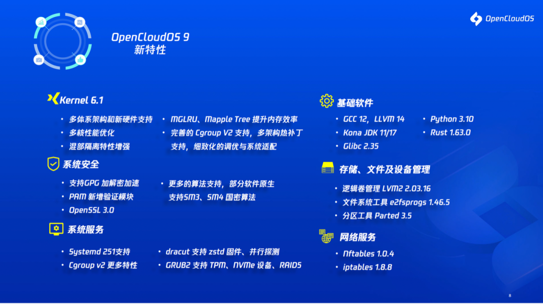 本次发布的 L3 社区版 OC 9.0,是基于 L1 源社区的 OpenCloudOS Stream 优化推出,由腾讯与 Intel、北京红旗、中兴、龙芯、中科方德等二十余家单位共同研发。OC 9 使用上游社区最新内核 Kernel 6.1,提供多体系架构和新硬件支持,多核性能优化,混部隔离特性增强。同时,MGLRU、Mapple Tree 等特性提升内存管理效率,具备完善的 Cgroup V2 支持、多架构热补丁支持,并提供细致化的调优与系统适配。