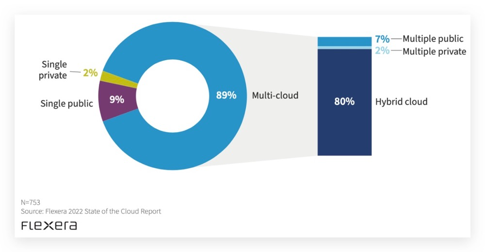 公有云与私有云业务的融合在业内称之为混合云。《Flexera 2022 年云状况报告》调查显示:89% 的企业采用了多云战略,80% 的企业拥有混合云策略。