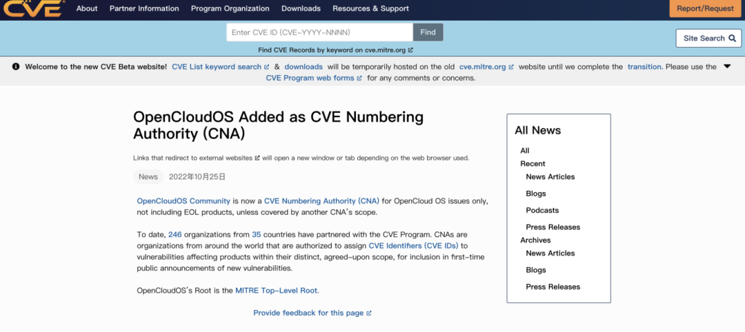 2022年10月25日,OpenCloudOS社区正式通过CNA准入程序,成为官方许可的CVE编号授权机构。