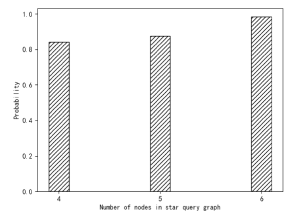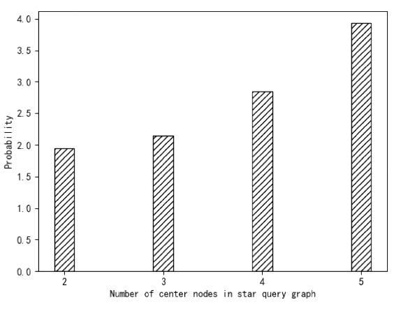 第一个方面是有一个中心节点的星形查询模式,设置了三组不同的星形查询,中心节点只有一个,相邻节点分别为3、4、5。图1描述了一个有一个中心节点的星形查询的查询响应时间。可以看出,随着查询图中节点和边的数量增加查询所花费的时间以缓慢的速度增加。主要原因是在查询过程中,需要更多的时间来匹配城市交通知识图谱中具有更多节点的查询子图。