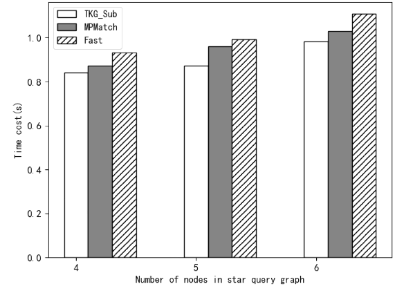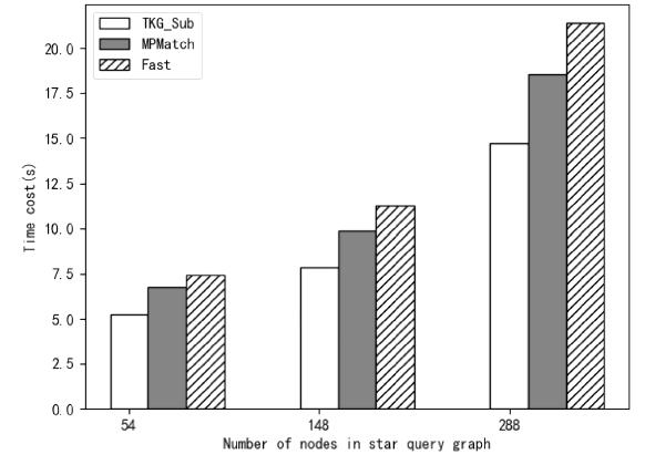 图3.TKG_Sub、MPMatch和Fast在有一个中心节点的星形查询模式下的实验结果