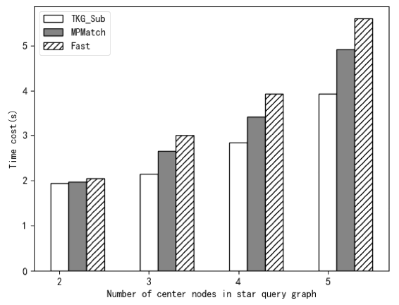 图5.TKG_Sub、MPMatch和Fast在有多个中心节点的星形查询模式下的实验结果